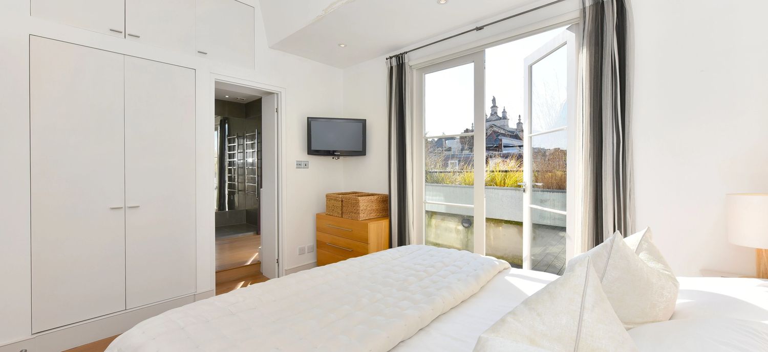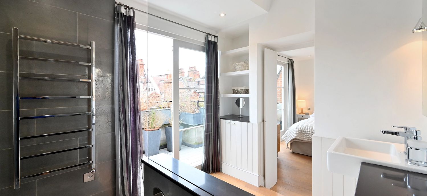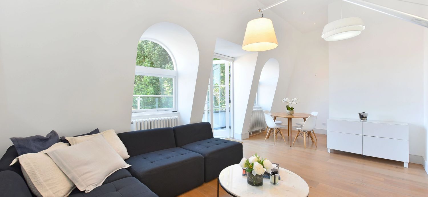 This gorgeous apartment boasts a spacious south facing reception room with French doors opening on to a private terrace with garden views below. Benefiting from an abundance of natural light throughout the day, the entertaining space is further enhanced by vaulted ceilings and tasteful neutral decor. The property further benefits from a modern open-plan kitchen, large double bedroom with built-in storage and another set of French doors that open directly on to a second private terrace. An expansive and modern fully tiled en-suite bathroom with double shower and further access to the front terrace complete this lovely lateral space. The apartment is tastefully finished with contemporary furnishings and wooden flooring throughout.