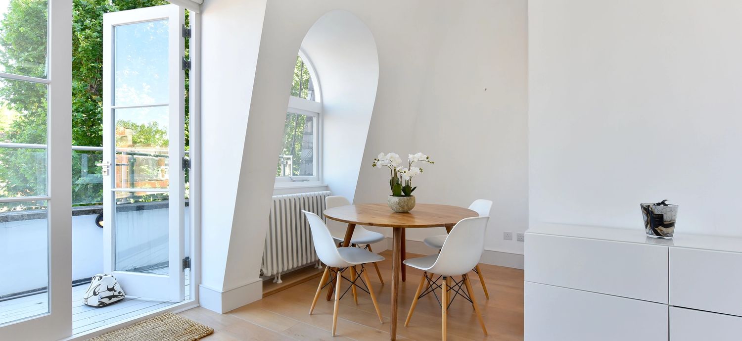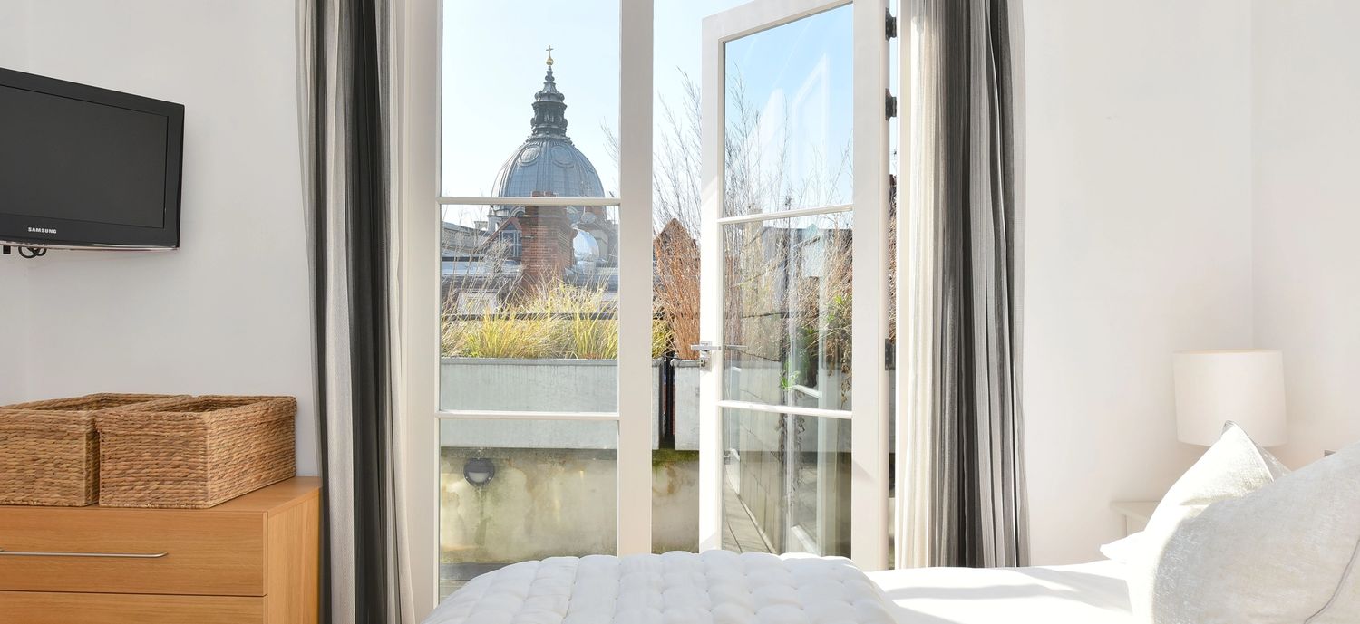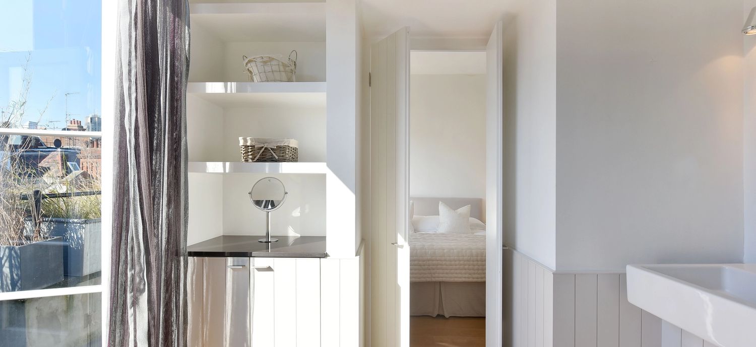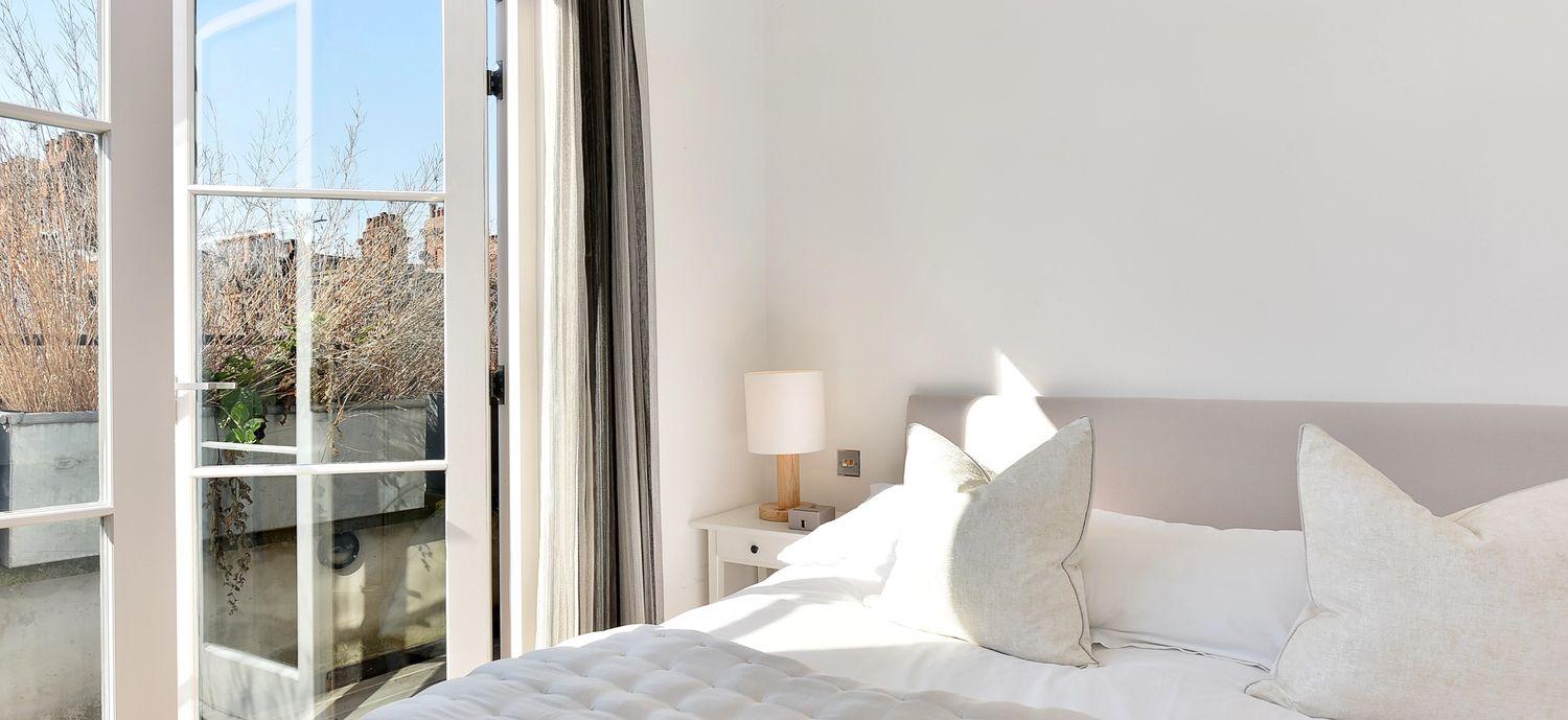 This gorgeous apartment boasts a spacious south facing reception room with French doors opening on to a private terrace with garden views below. Benefiting from an abundance of natural light throughout the day, the entertaining space is further enhanced by vaulted ceilings and tasteful neutral decor. The property further benefits from a modern open-plan kitchen, large double bedroom with built-in storage and another set of French doors that open directly on to a second private terrace. An expansive and modern fully tiled en-suite bathroom with double shower and further access to the front terrace complete this lovely lateral space. The apartment is tastefully finished with contemporary furnishings and wooden flooring throughout.