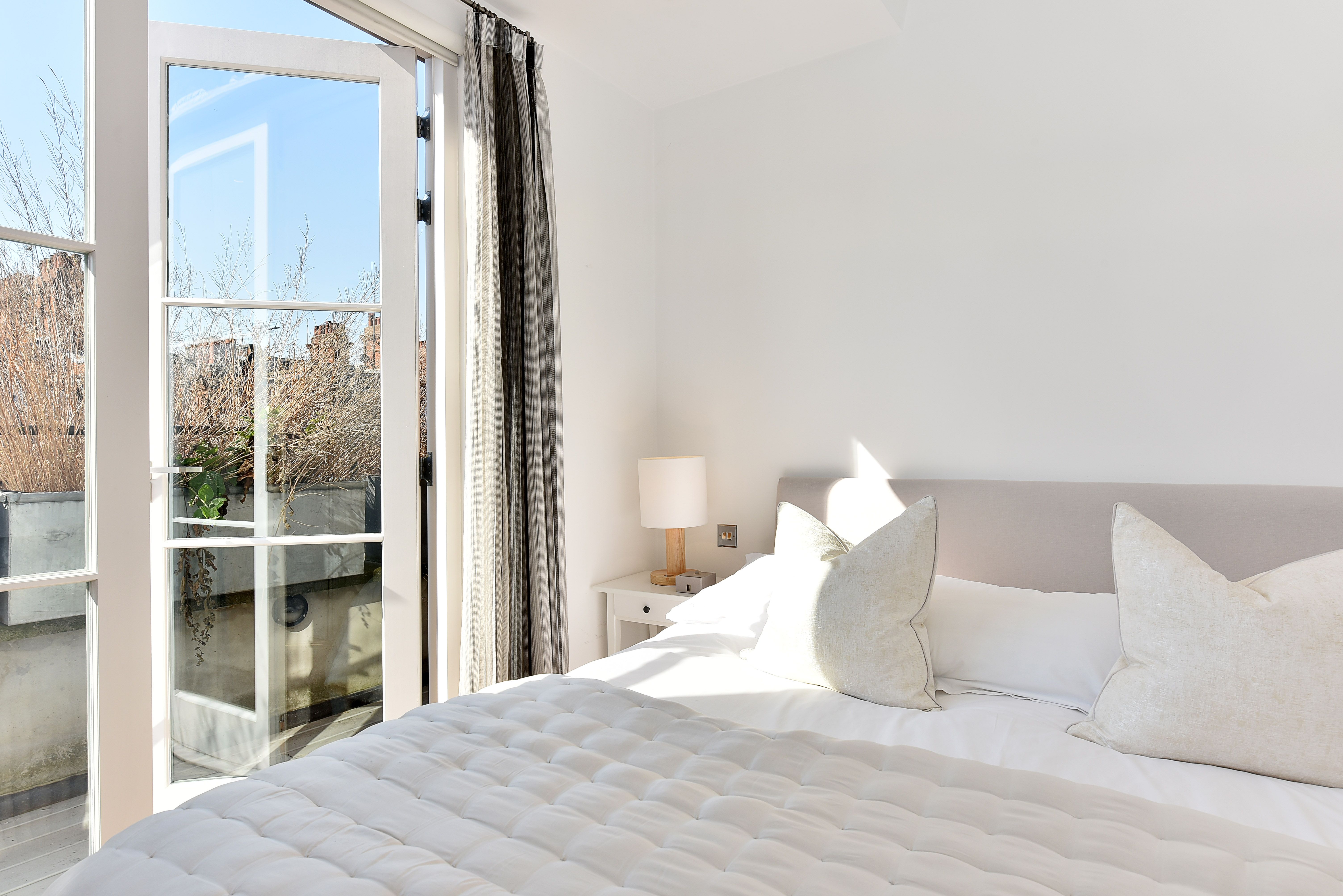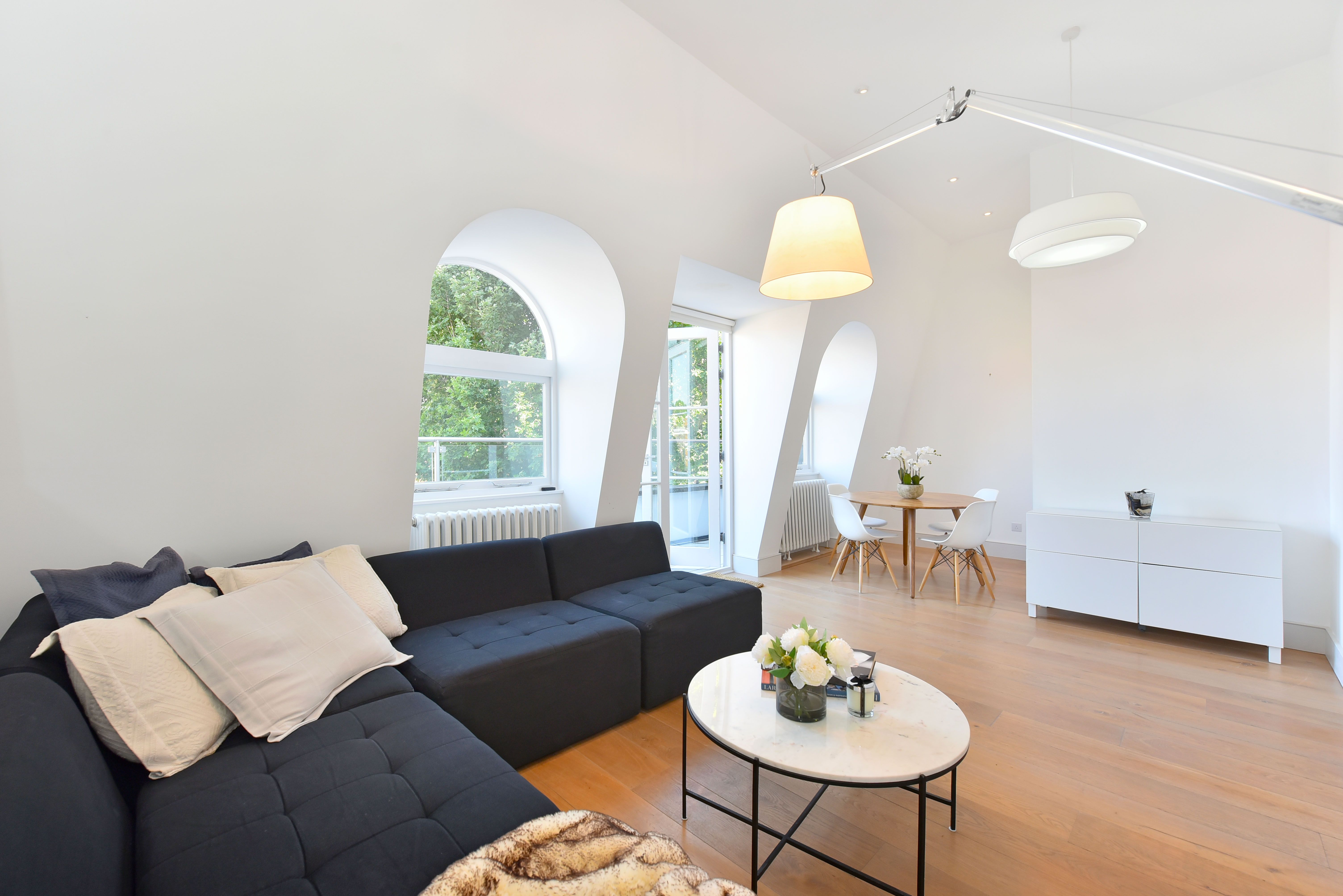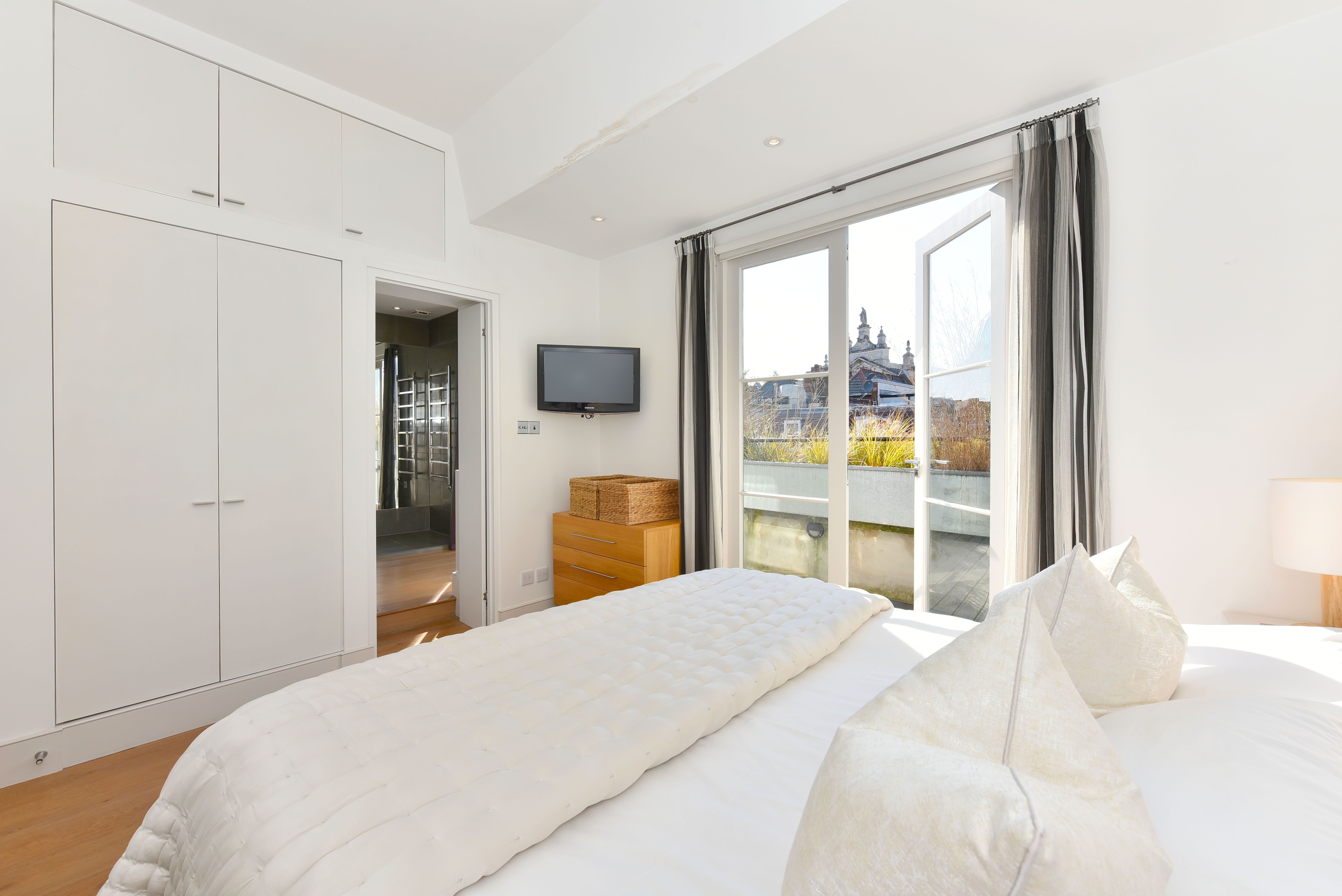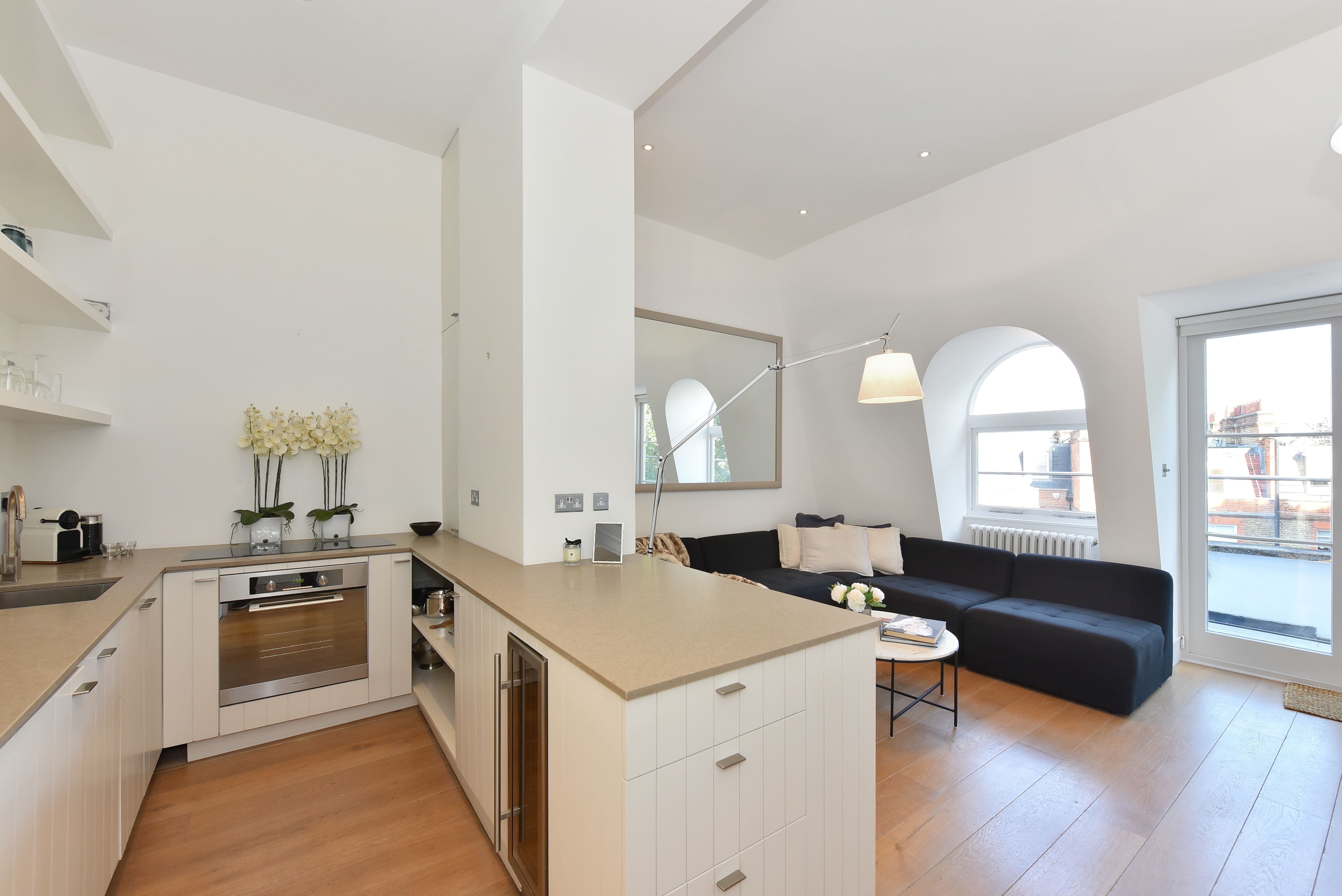 This gorgeous apartment boasts a spacious south facing reception room with French doors opening on to a private terrace with garden views below. Benefiting from an abundance of natural light throughout the day, the entertaining space is further enhanced by vaulted ceilings and tasteful neutral decor. The property further benefits from a modern open-plan kitchen, large double bedroom with built-in storage and another set of French doors that open directly on to a second private terrace. An expansive and modern fully tiled en-suite bathroom with double shower and further access to the front terrace complete this lovely lateral space. The apartment is tastefully finished with contemporary furnishings and wooden flooring throughout.