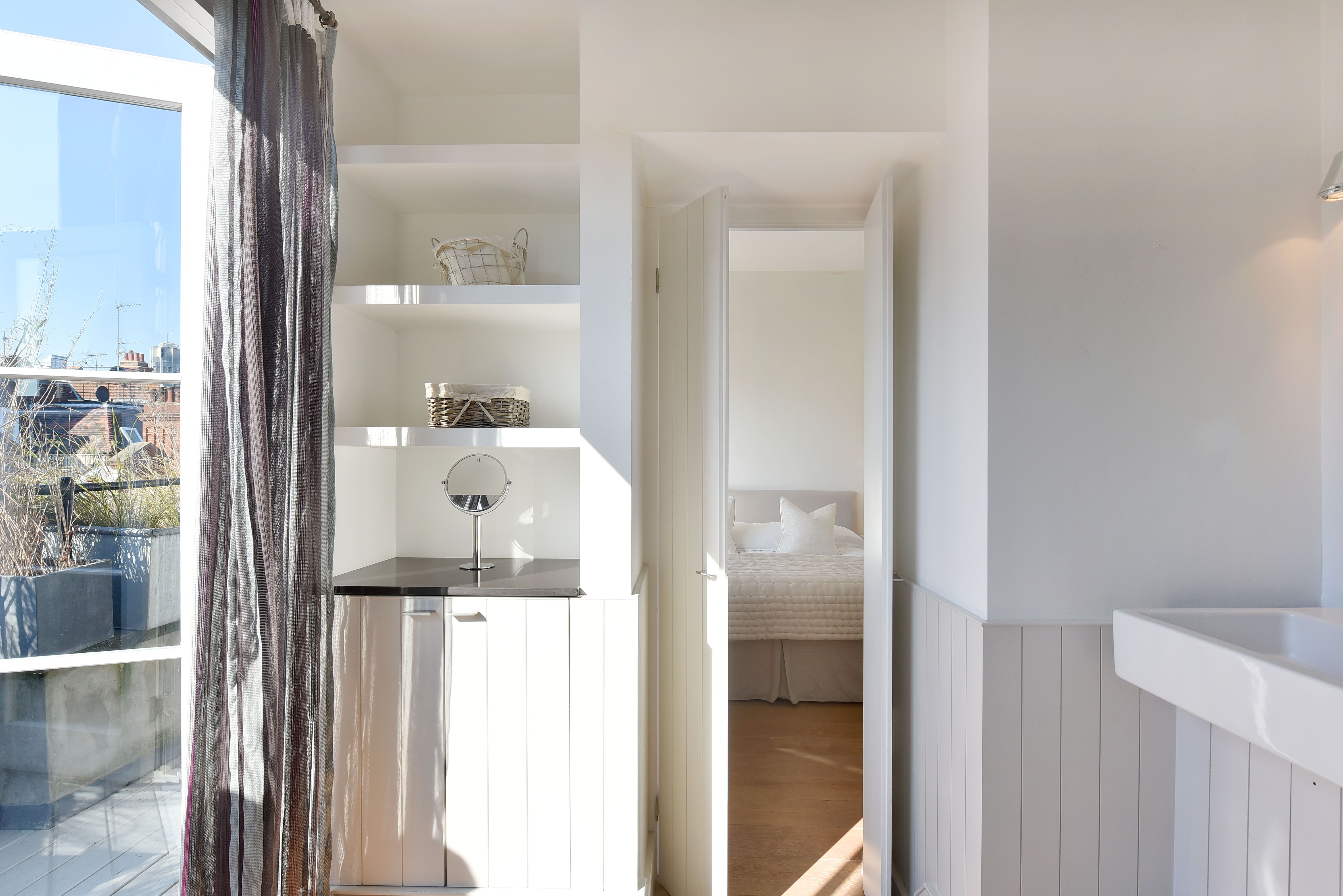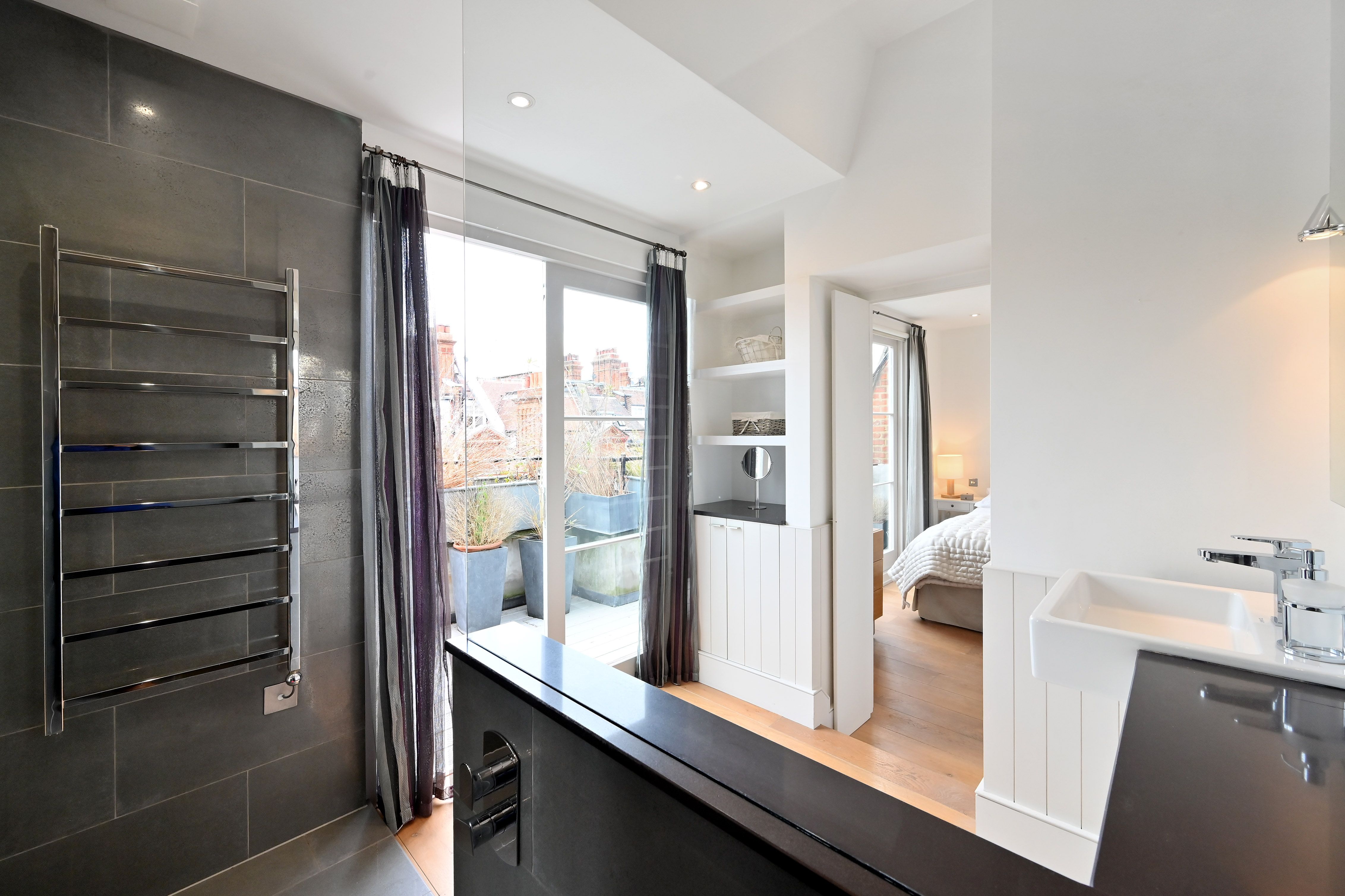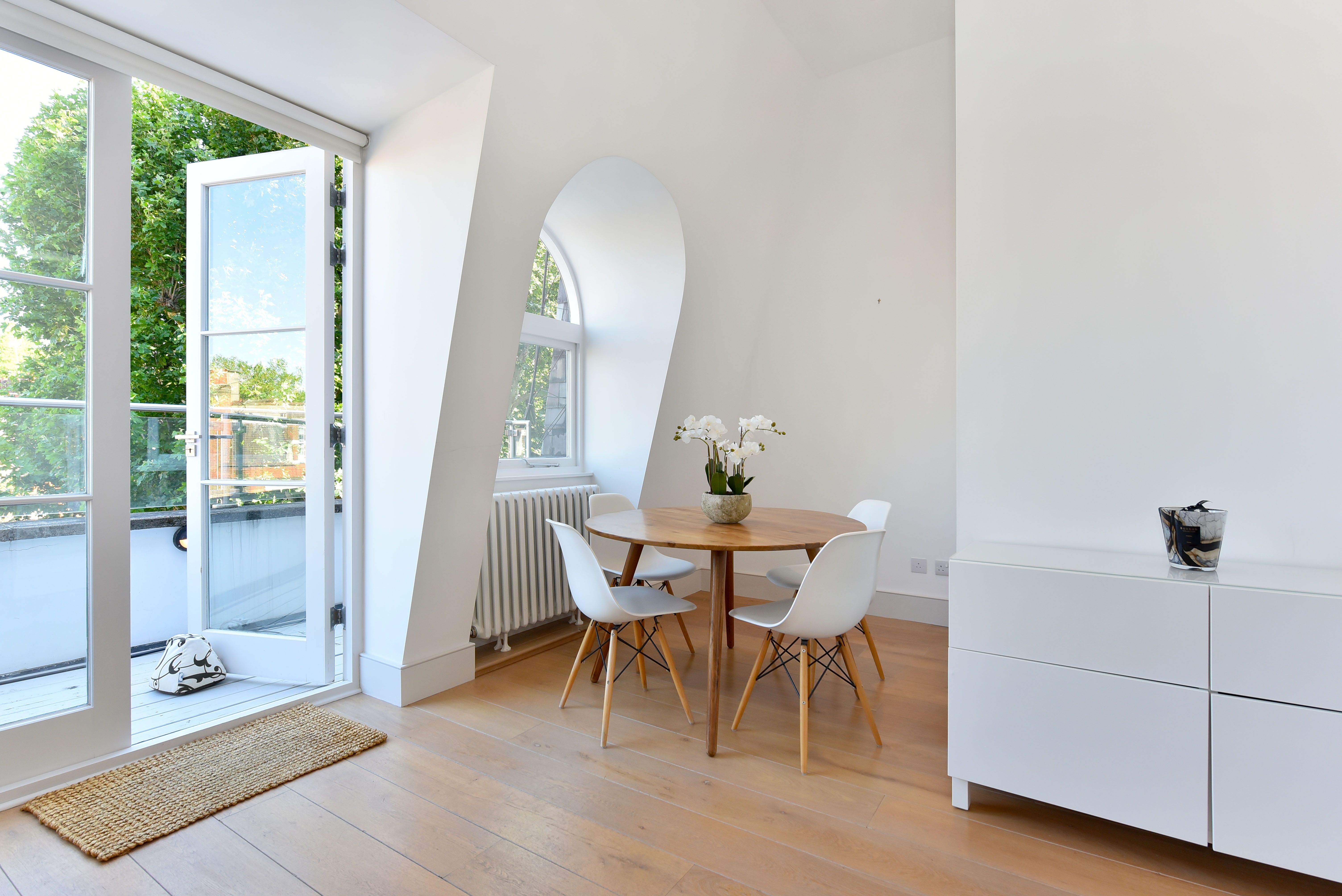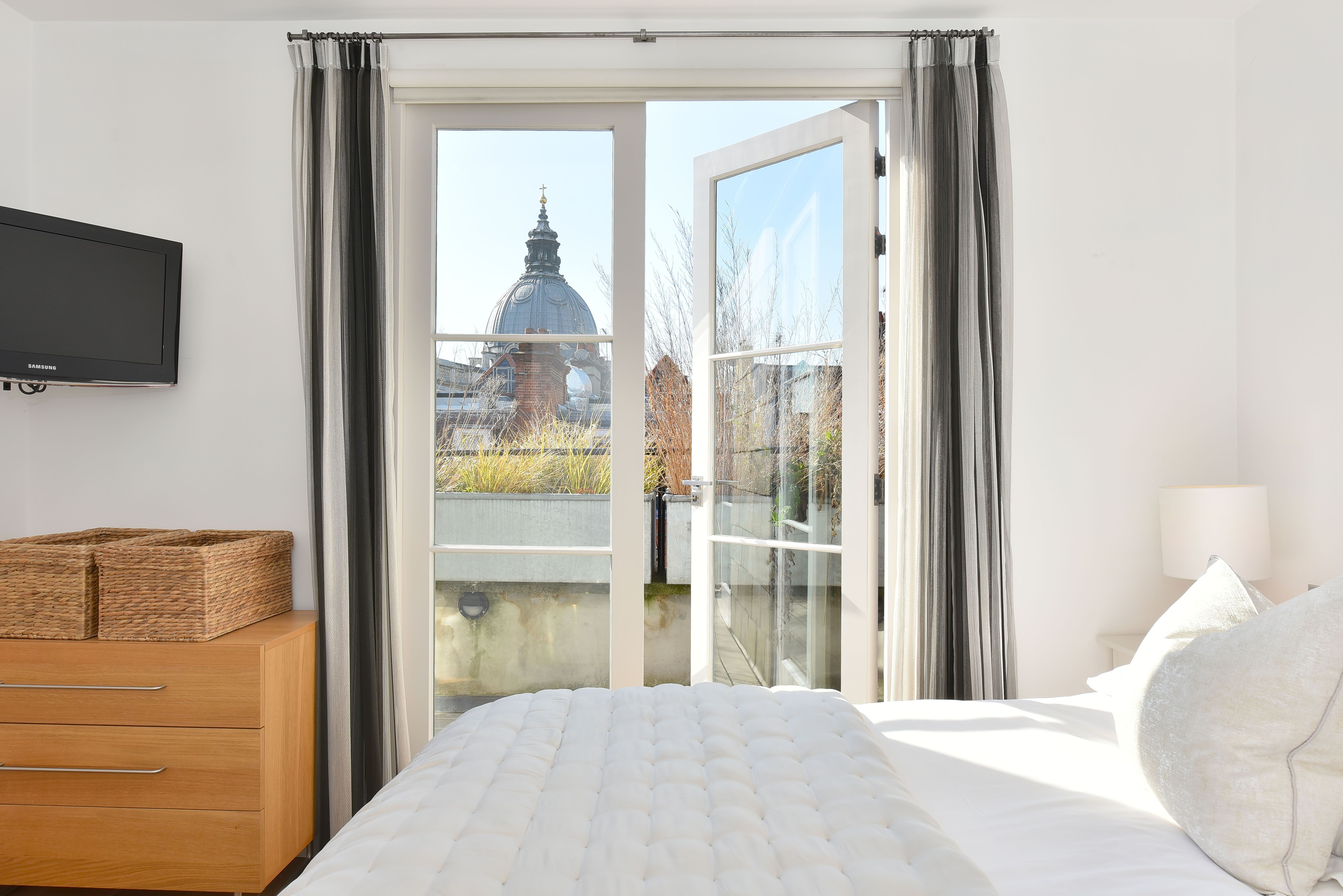 This gorgeous apartment boasts a spacious south facing reception room with French doors opening on to a private terrace with garden views below. Benefiting from an abundance of natural light throughout the day, the entertaining space is further enhanced by vaulted ceilings and tasteful neutral decor. The property further benefits from a modern open-plan kitchen, large double bedroom with built-in storage and another set of French doors that open directly on to a second private terrace. An expansive and modern fully tiled en-suite bathroom with double shower and further access to the front terrace complete this lovely lateral space. The apartment is tastefully finished with contemporary furnishings and wooden flooring throughout.
